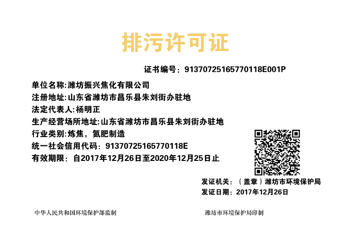 经过近一个月的共同努力,振兴焦化公司终于如期完成了环保排污许可证的办理工作,12月26日,环保排污许可证顺利发放,