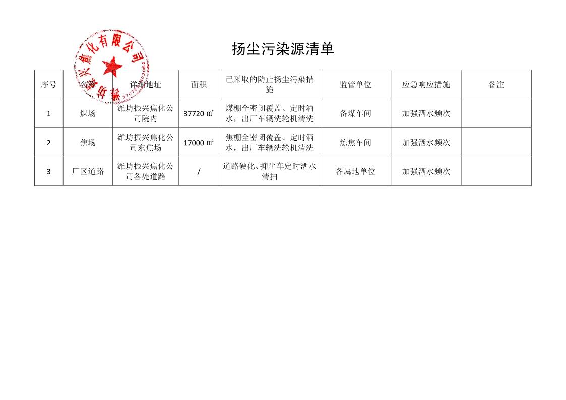 潍坊振兴焦化有限公司扬尘污染源清单