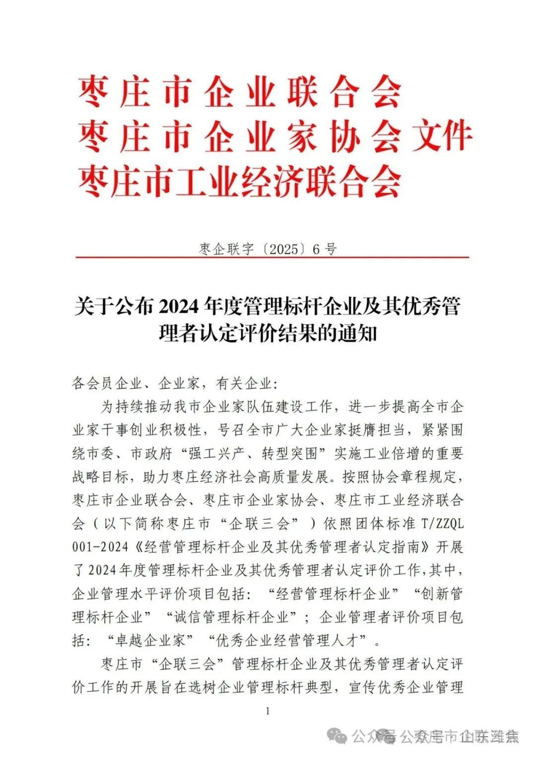 近日,枣庄市企业联合会、枣庄市企业家协会、枣庄市工业联合会发布《关于2024年管理标杆企业及其优 秀管理者认定评价结果的通知》,山东2007so太阳集团集团薛城能源有限公司、枣庄杰富意振兴化工有限公司荣获2024年度“经营管理标杆企业”称号。这是对两公司经营管理水平、管理创新能力等方面的充分肯定和认可。