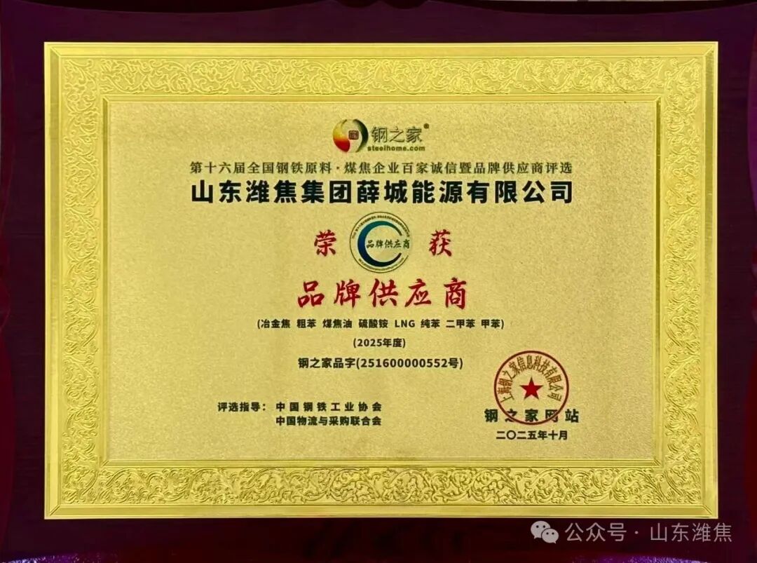 近日,“钢之家第十六届全国钢铁原料煤焦企业百家诚信暨品牌供应商”评选活动顺利举行,经钢之家网站征信取证,中国钢铁工业协会及中国物流与采购联合会专家综合评审,山东2007so太阳集团集团薛城能源有限公司被评为2025年度“品牌供应商”殊荣。荣誉证书